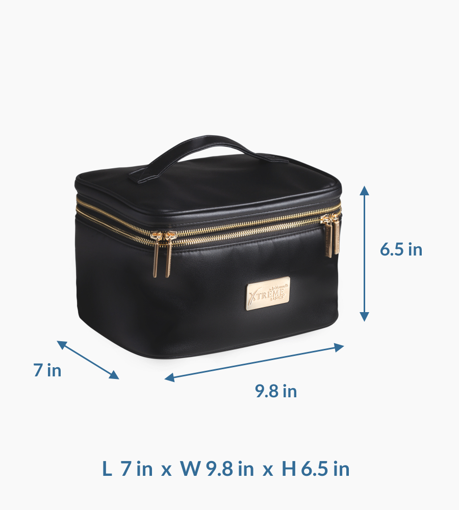 Use the sleek Classic Carry-All to keep all your Xtreme Lashes® by Jo Mousselli eyelash extensions compatible cosmetics, aftercare essentials, makeup, and accessories within reach! Perfectly sized for daily use or travel, this spacious cosmetic bag features a faux leather exterior and two zippered compartments for quick access to all your beauty essentials.
